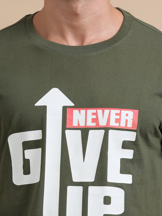 Never Give Up Printed Olive Green short sleeve Regular T-shirt